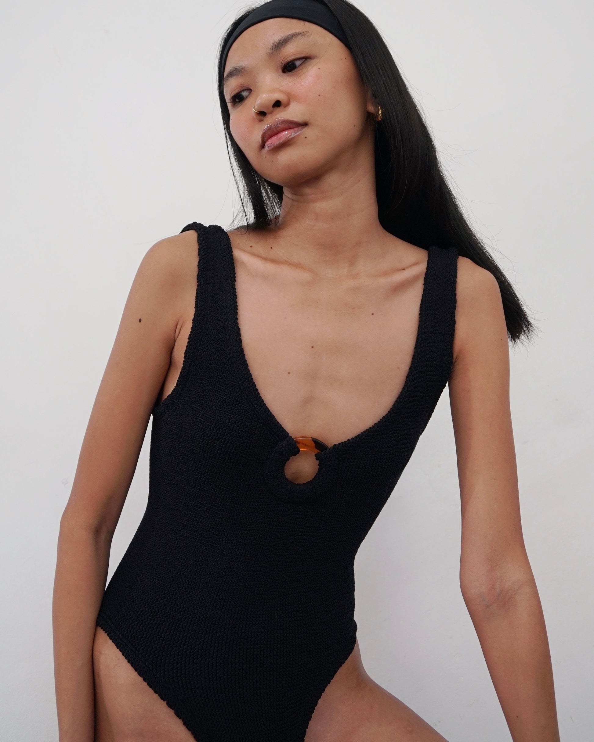 Hunza G plunging one piece swimsuit with hoop detail.
