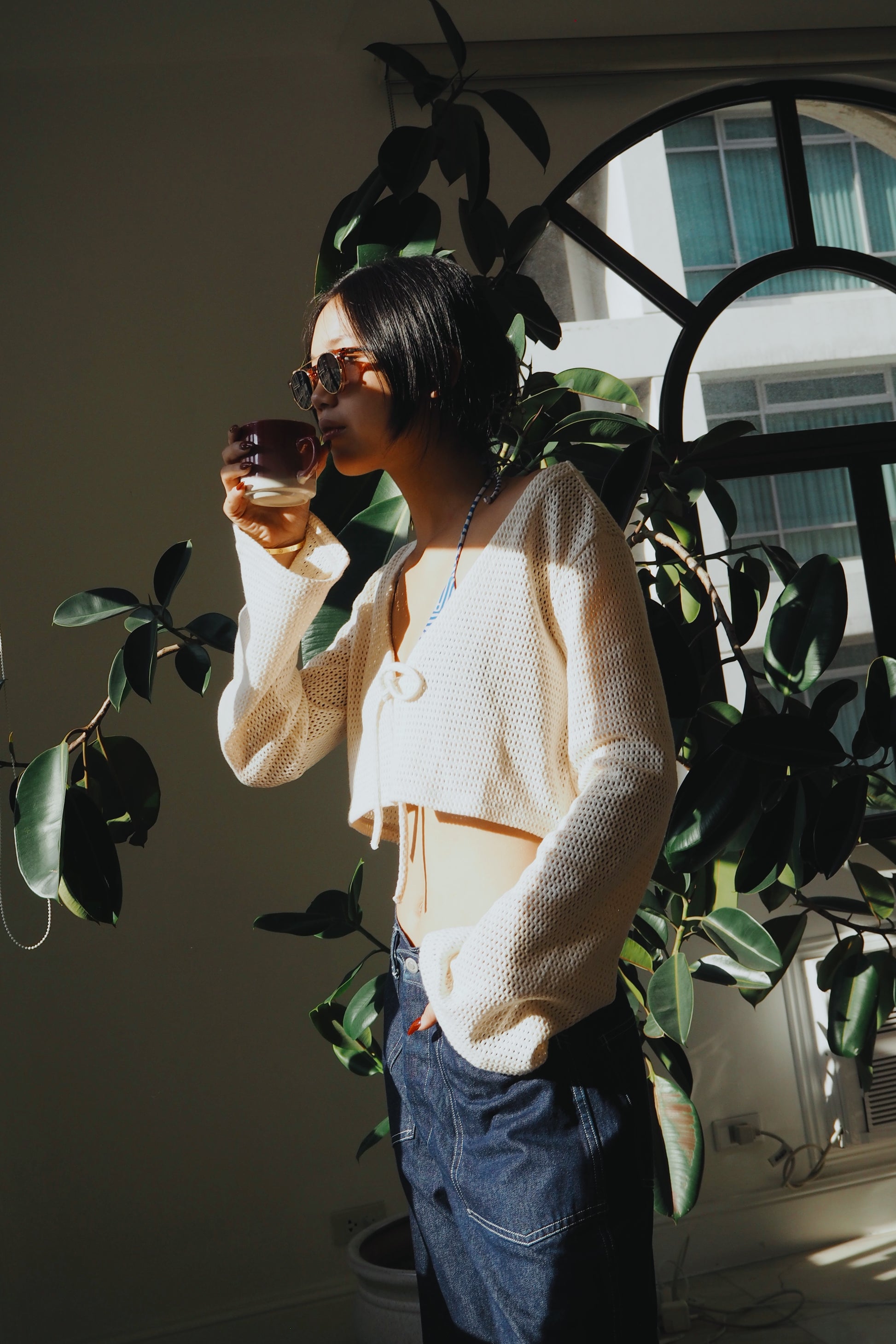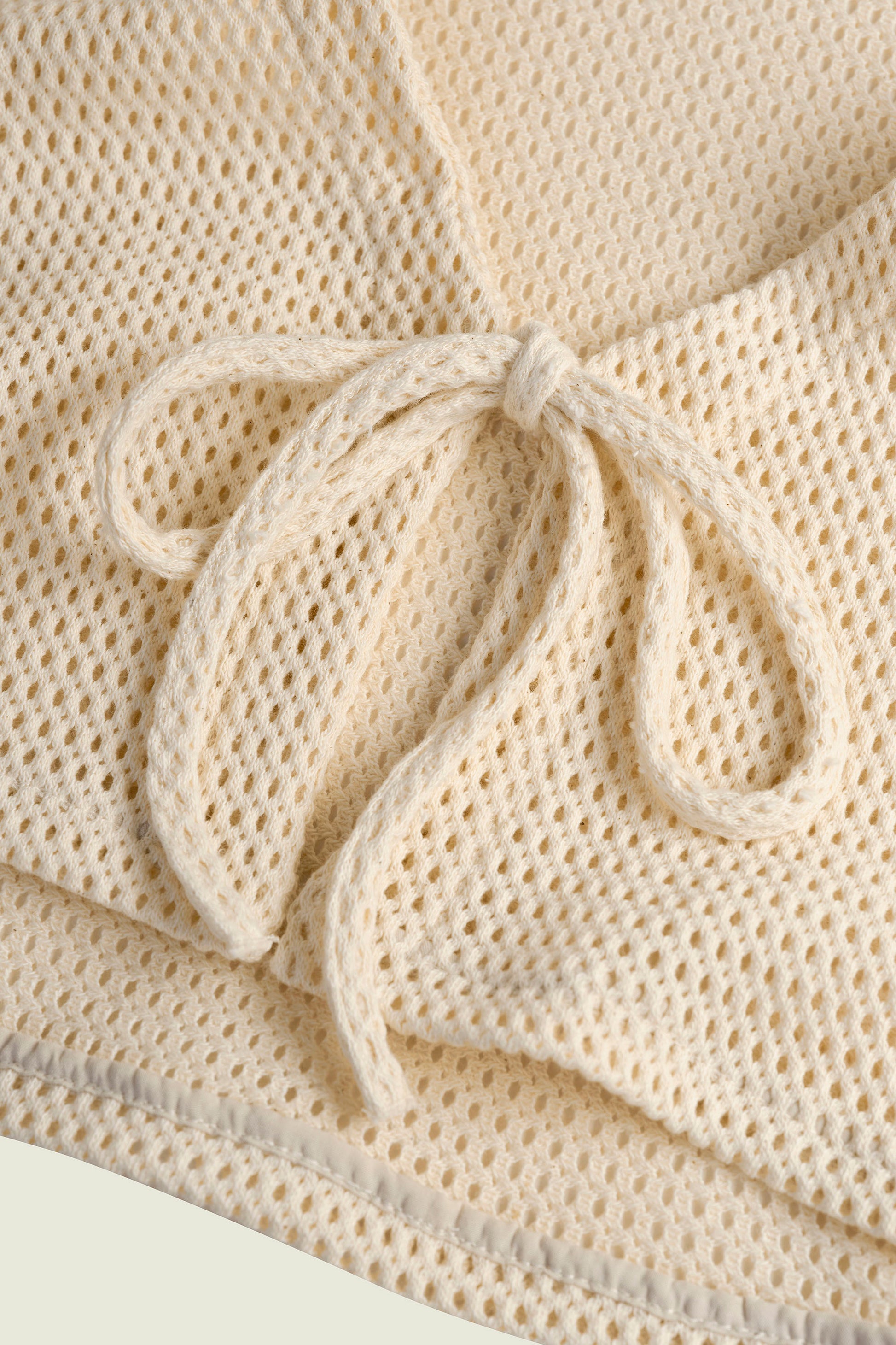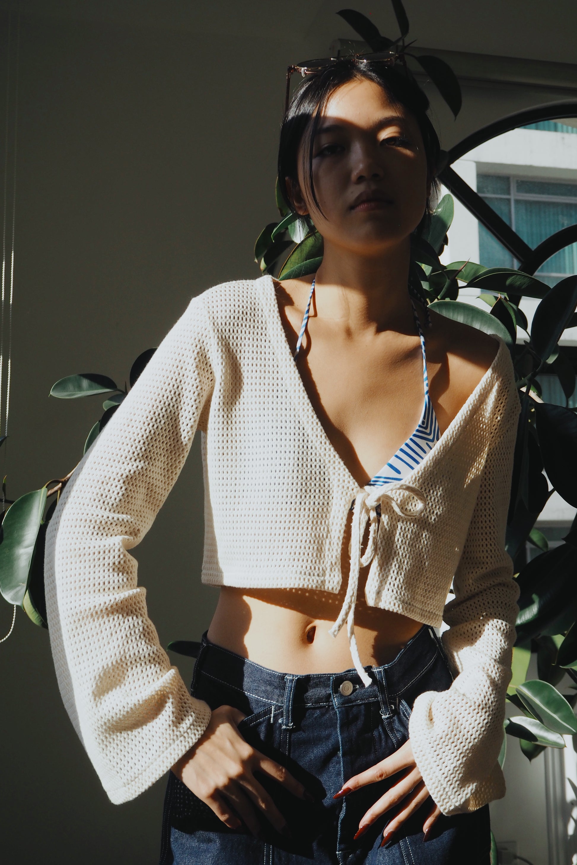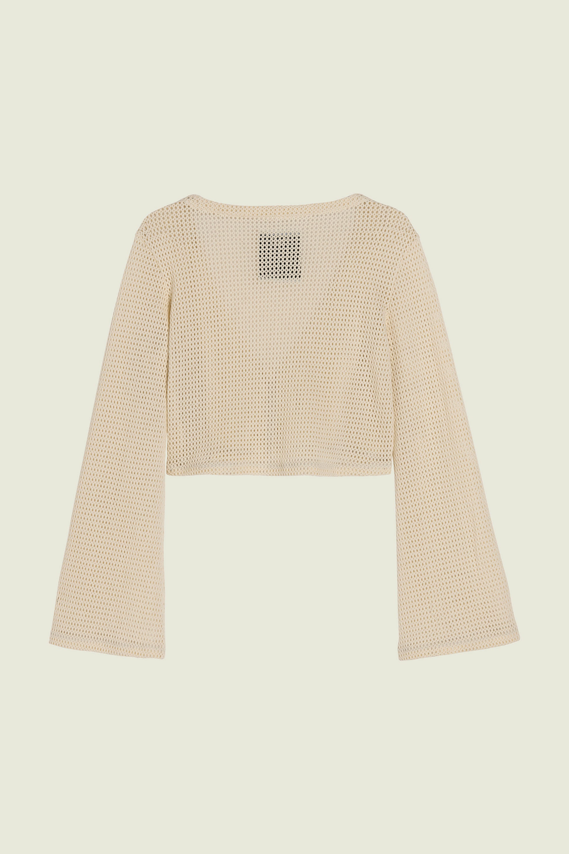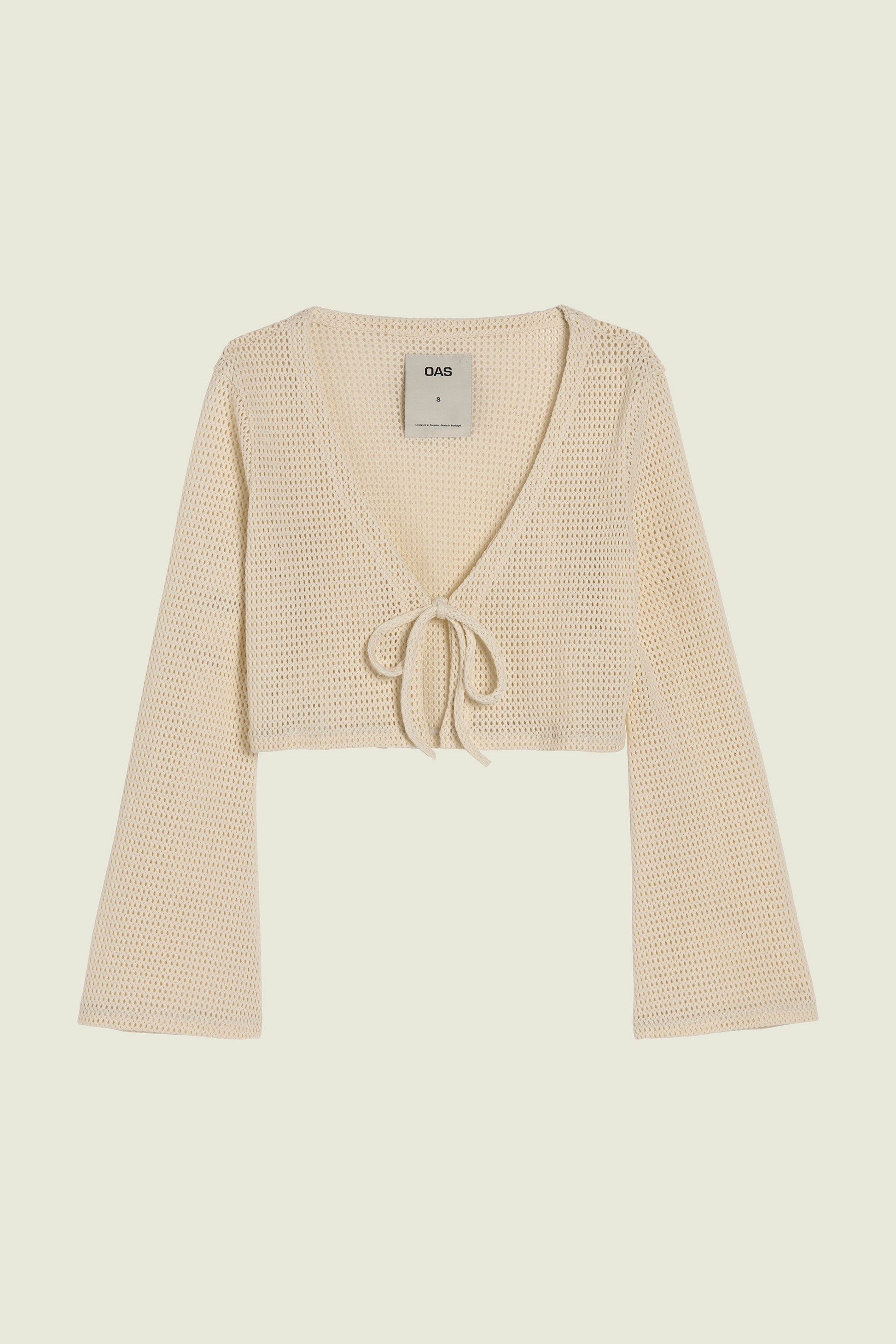 The Ecru Vacay Net Top by Swedish brand OAS is a breezy cardigan made in an unbleached cotton bobbinet weave. The cropped fit and deep V-neck, closed by a single tie at the chest, are balanced by elongated trumpet sleeves. Made in Portugal.