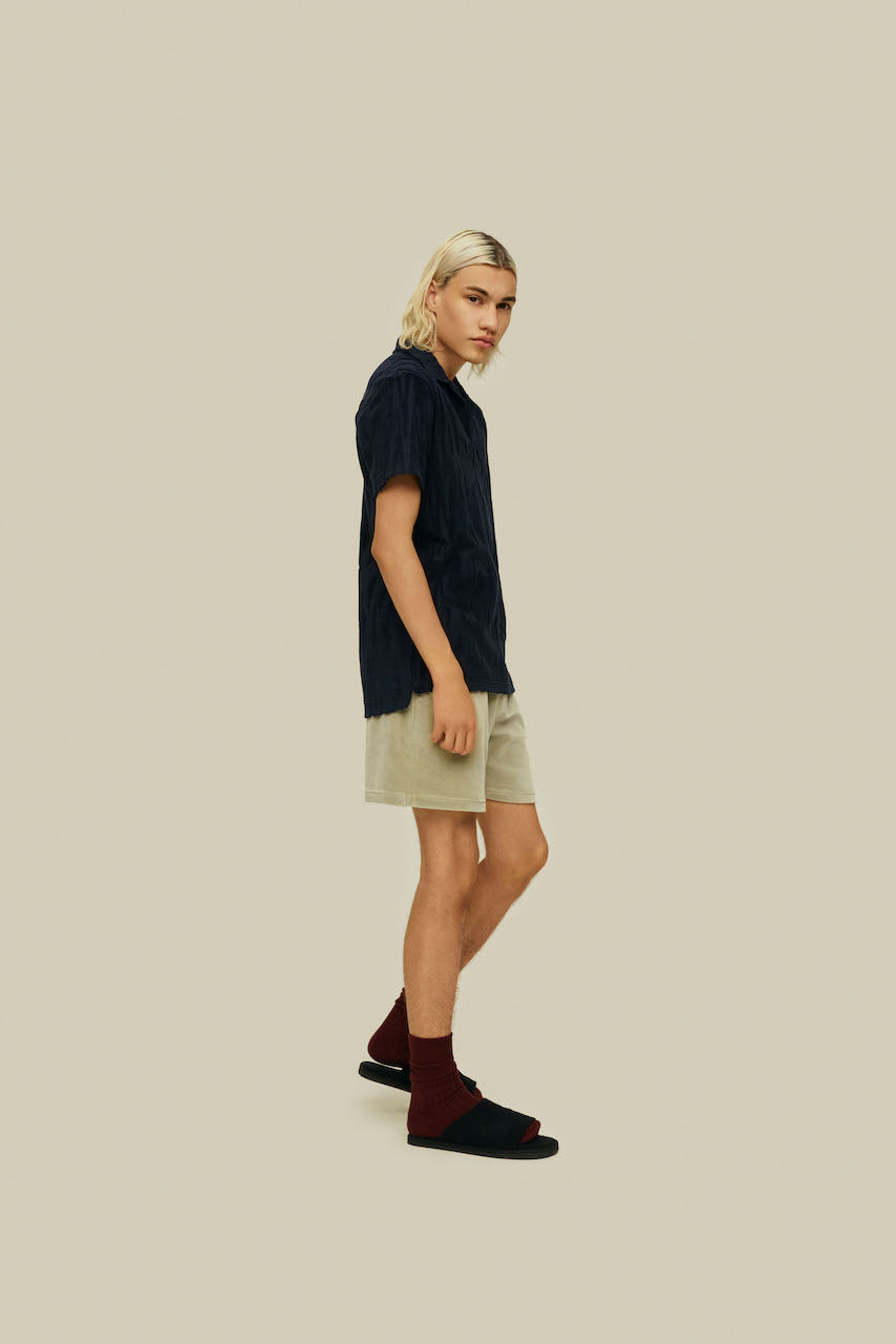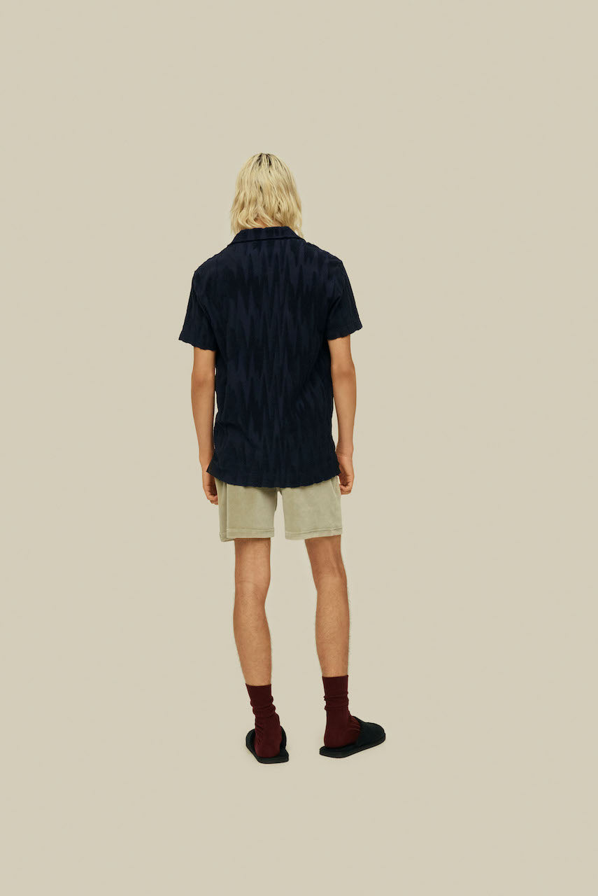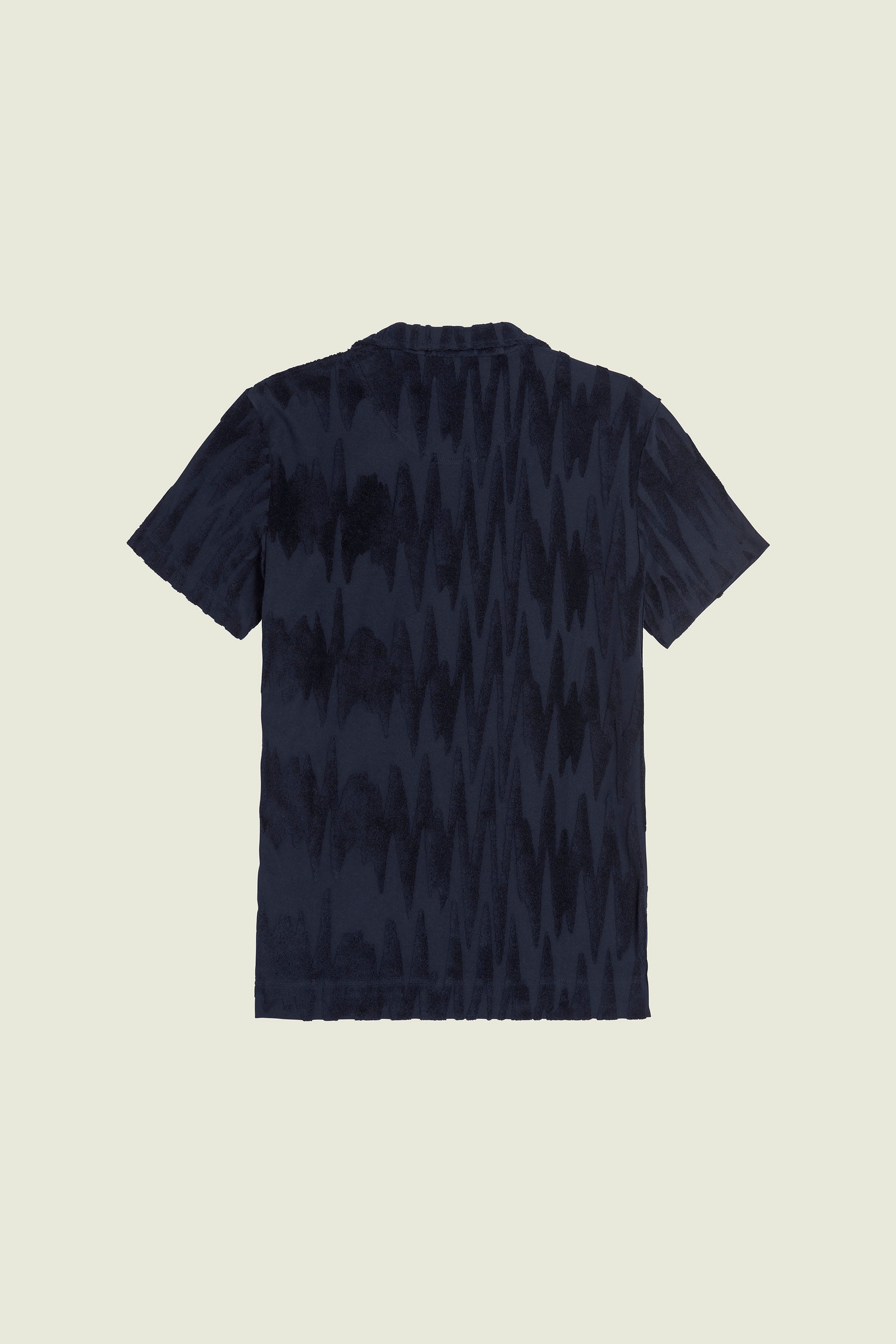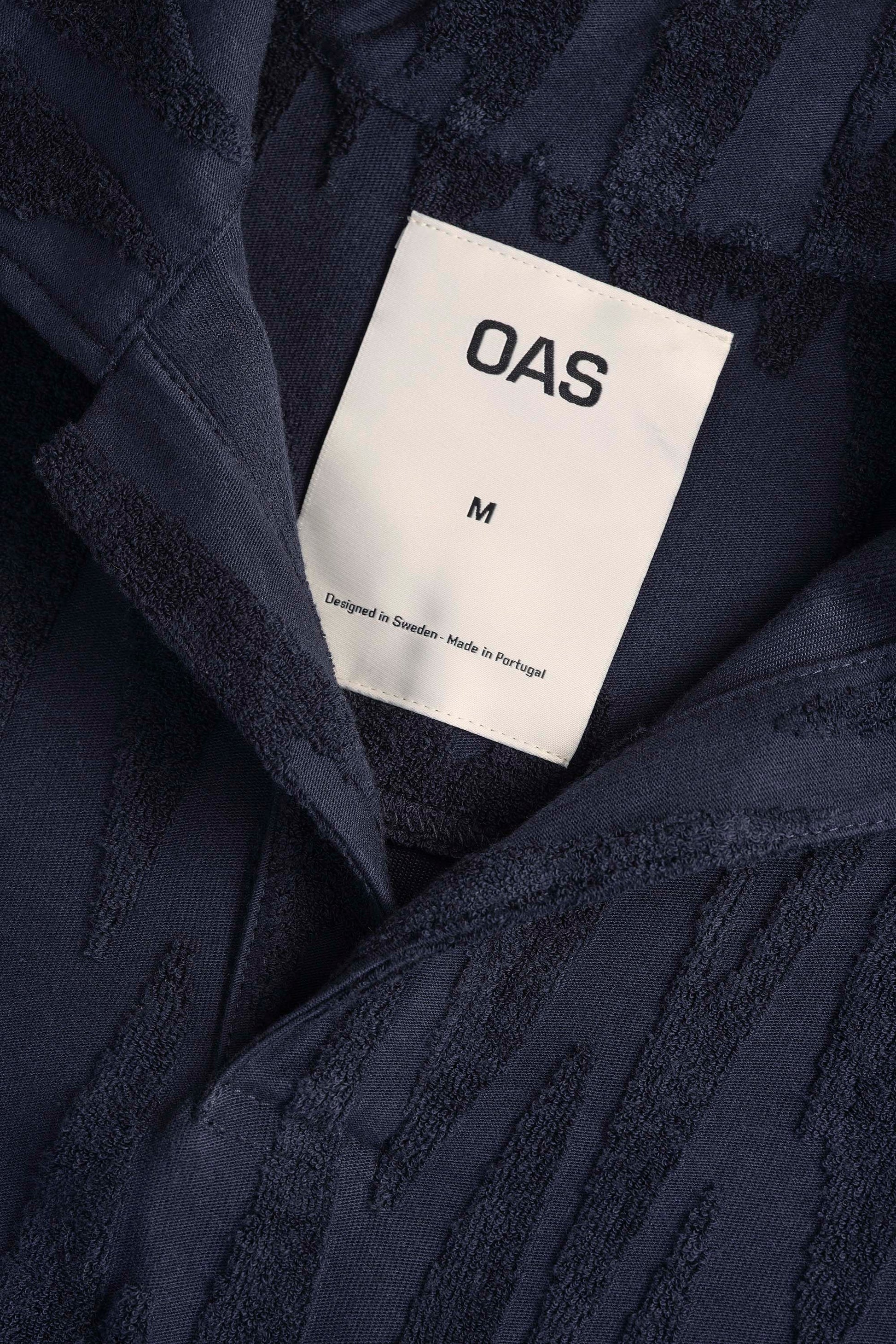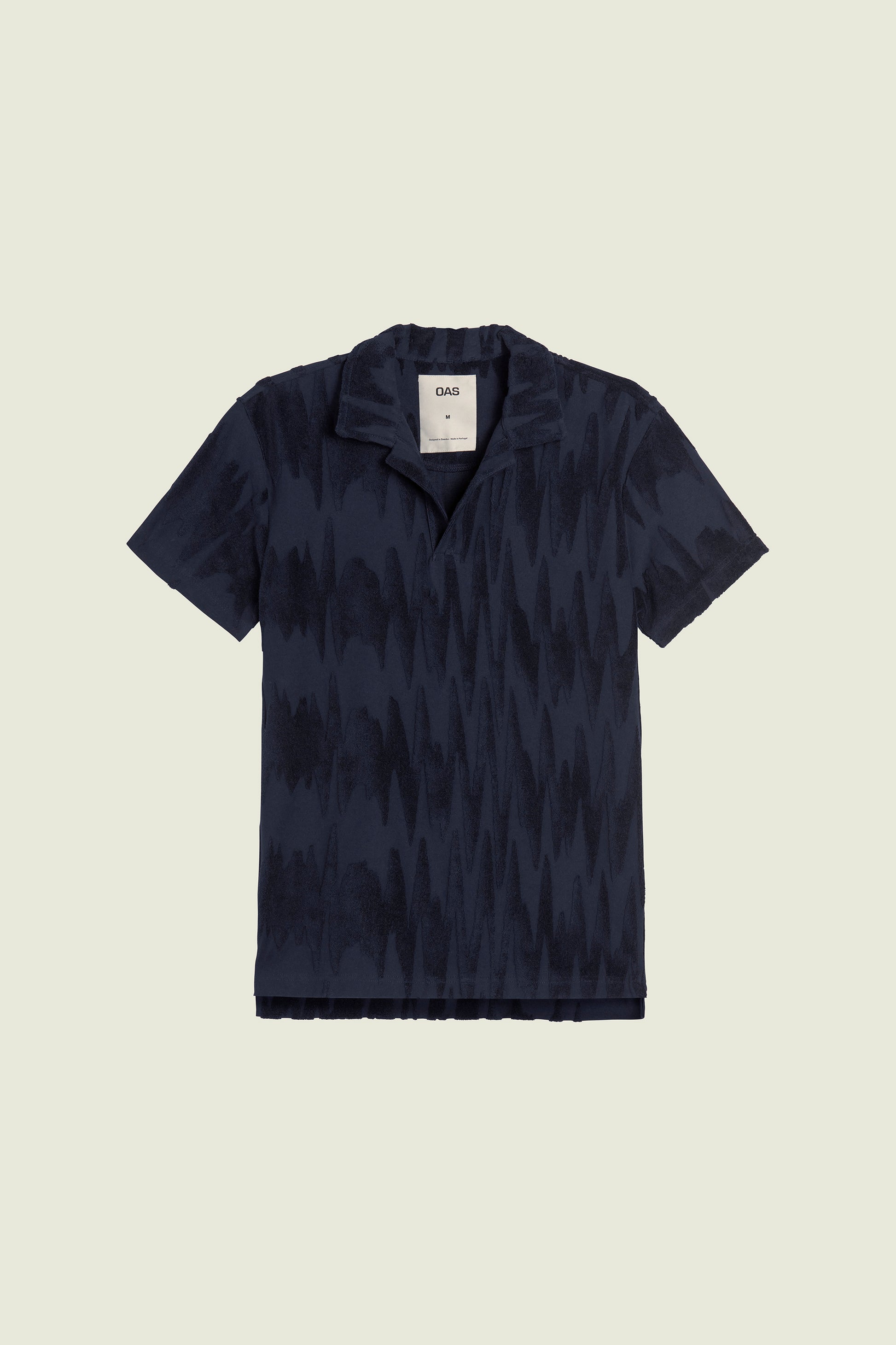 The Glitch Polo terry shirt from Swedish brand OAS features a midnight-blue textural pattern of slightly distorted zigzag stripes. Jacquard-woven from a breathable cotton fabric, with a polo collar and short sleeves.