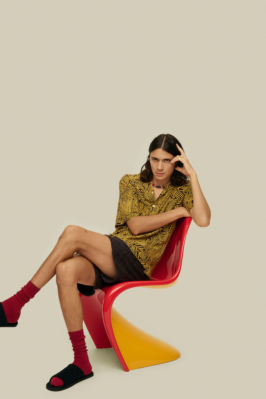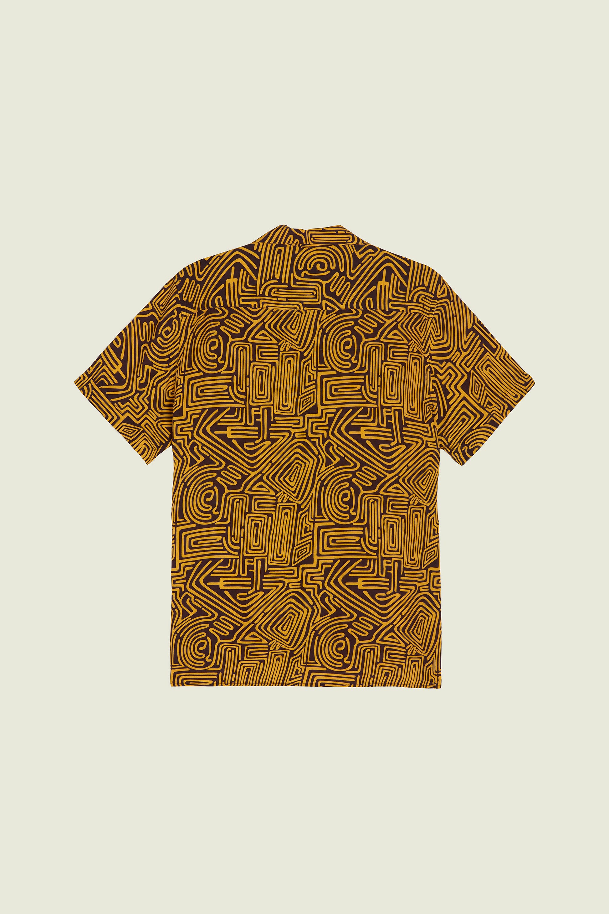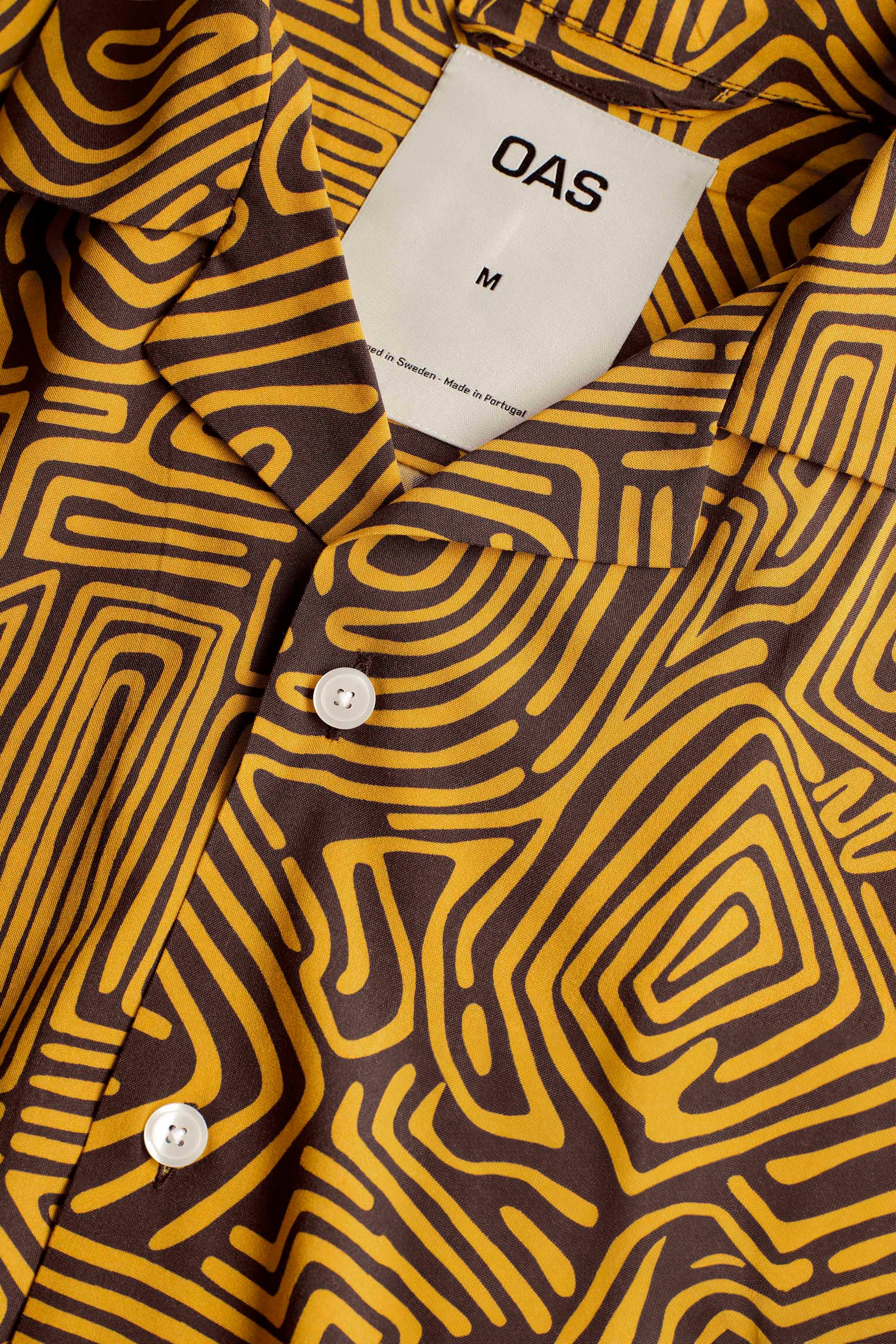The Tawny Golconda viscose shirt from Swedish brand OAS is a relaxed button down featuring print of hand-drawn labyrinthine shapes.