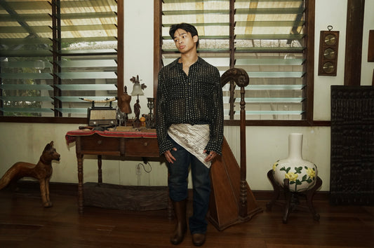 Spring Blossoms Beaded Silk Linen Shirt Salmon Sage