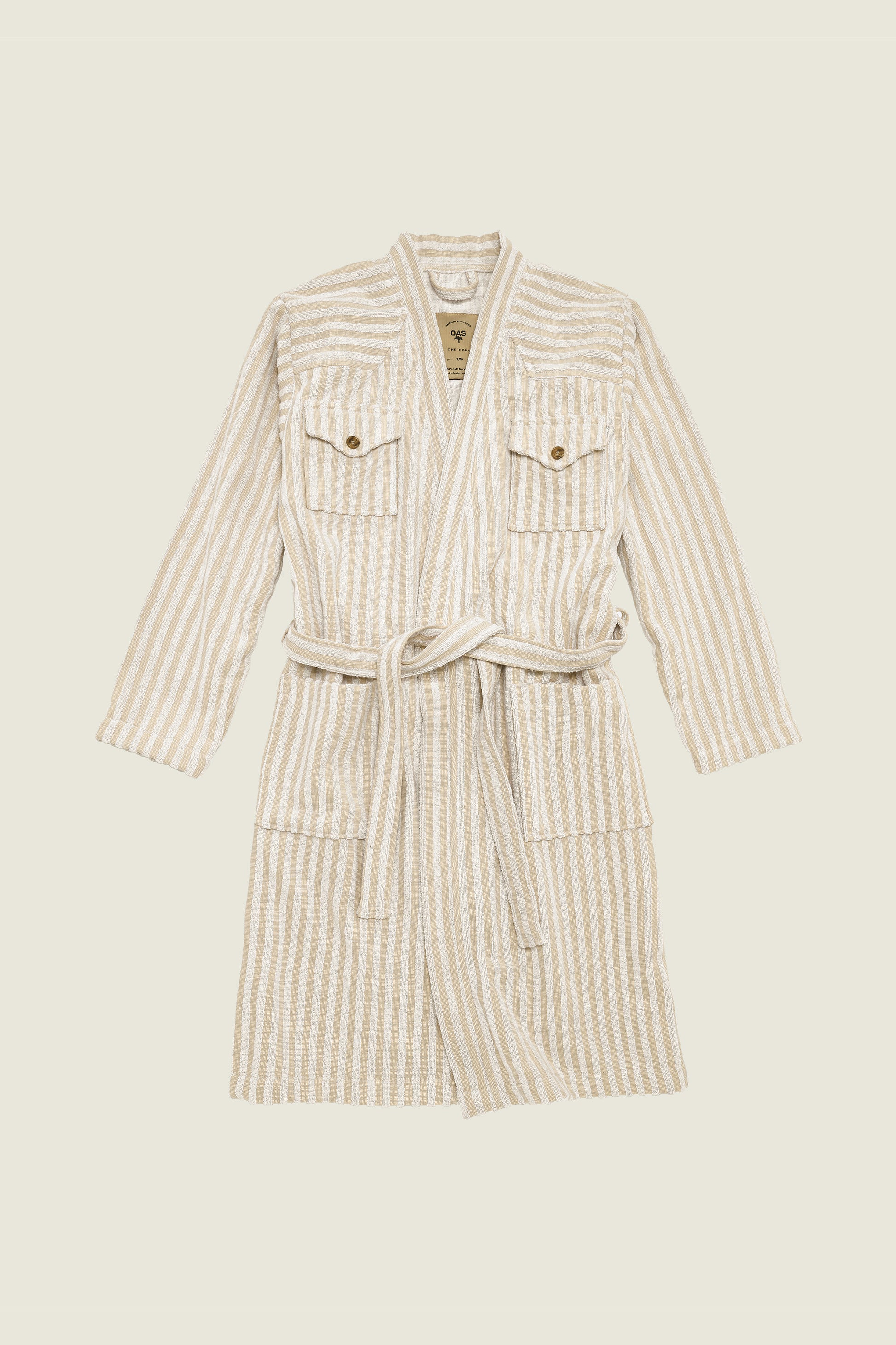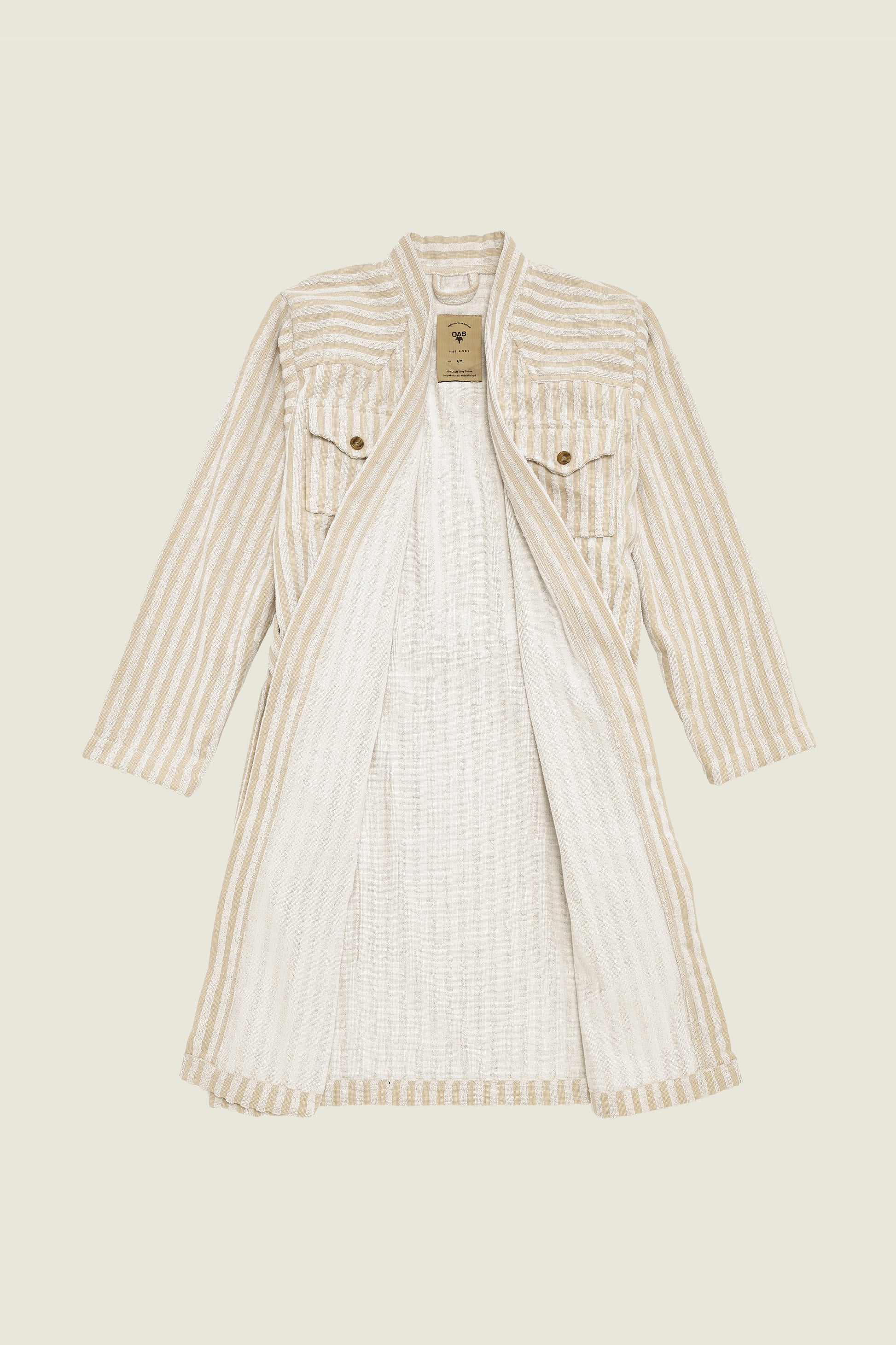 Western style cotton jacquard terrycloth robe by Swedish brand OAS. Features two front pockets and two buttoned chest pockets and self belt at the waist. Made in Portugal.