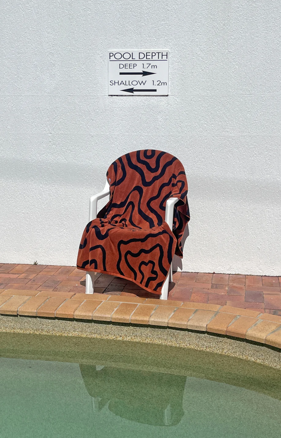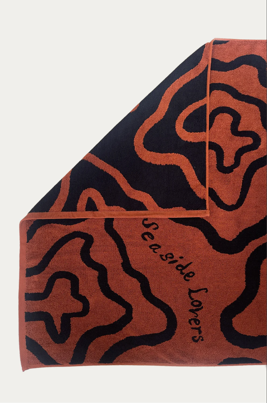 The Choc Bajo Beach Towel by SUKU offers a luxurious 100% cotton fabric with a 600 gsm medium loop pile, delivering a soft and absorbent feel. Measuring 180cm by 90cm, it provides ample coverage for beach or poolside use. Its jacquard design features a sophisticated chocolate brown and ebony Bajo print, complemented by chocolate binding and the Seaside Lovers logo, combining style with expert craftsmanship.