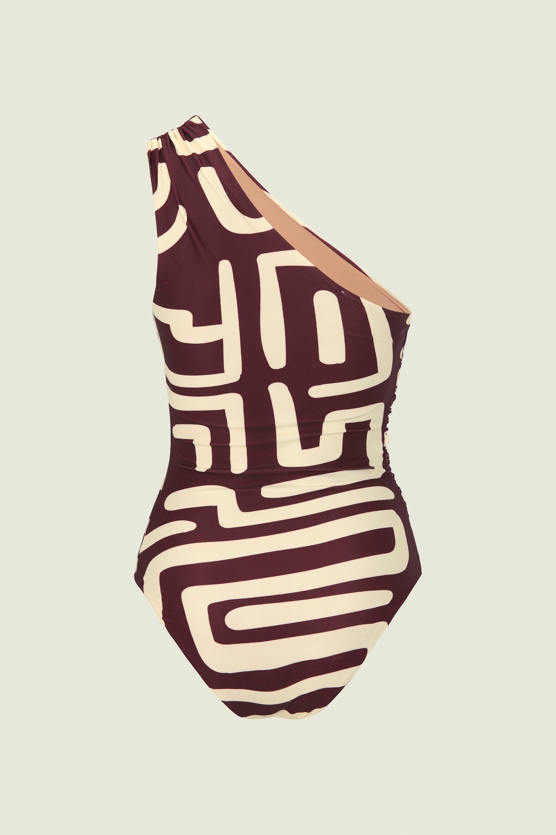 The Kalahara Jagger bathing suit by Swedish brand OAS is a one-shoulder silhouette adorned with an abstract pattern inspired by ancient cave paintings. Features ruching at the shoulder and through the side. Made from an UV-protective stretch fabric with a soft sheen, containing recycled polyester sourced from ocean waste. Fully lined.