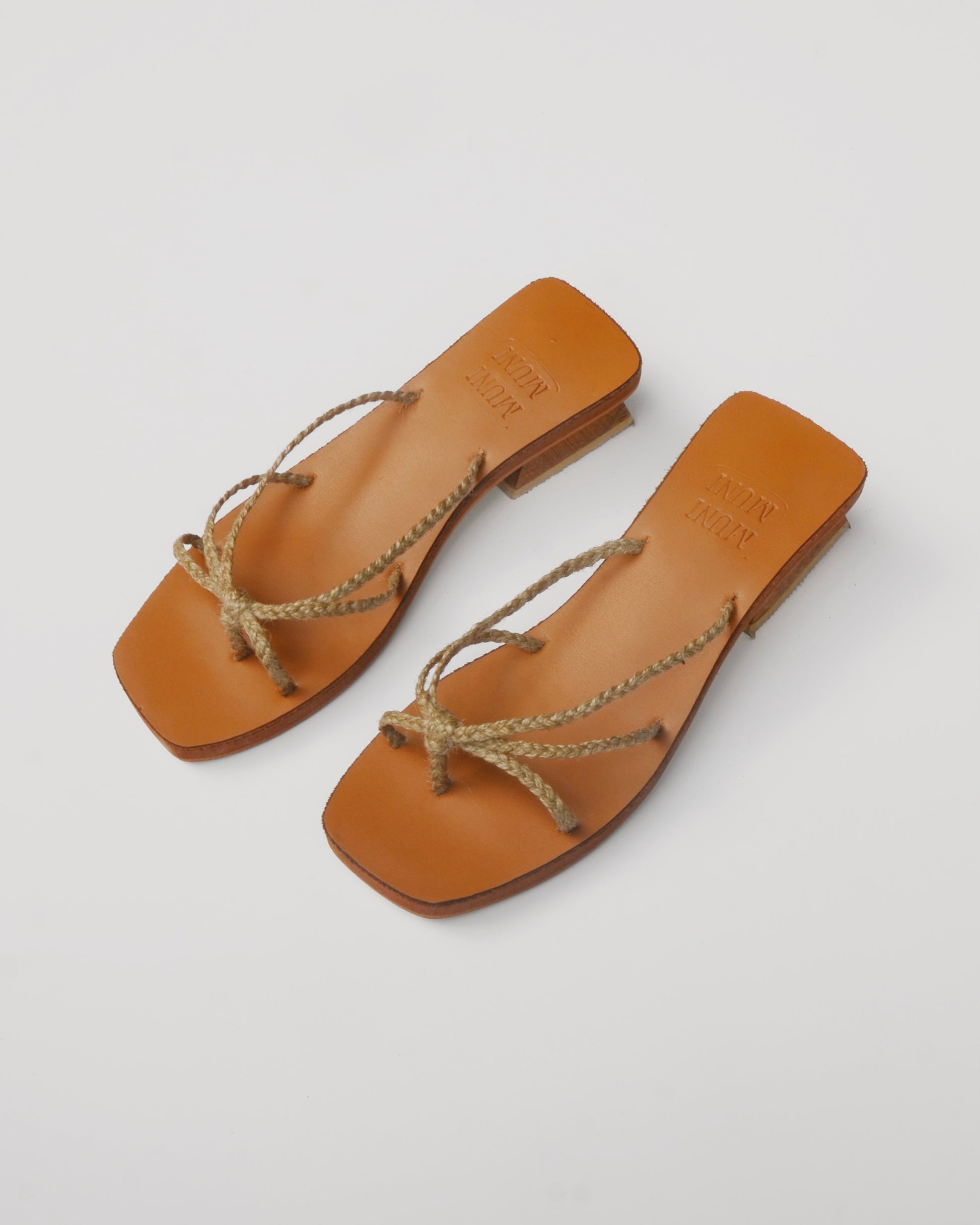 Low heeled sandals by Muni Muni, sourced and produced locally, integrated on vegan leather soles with wooden heels. *Note: Due to the hand-made nature of the product and naturally sourced materials, the colors and silhouettes may slightly vary across products