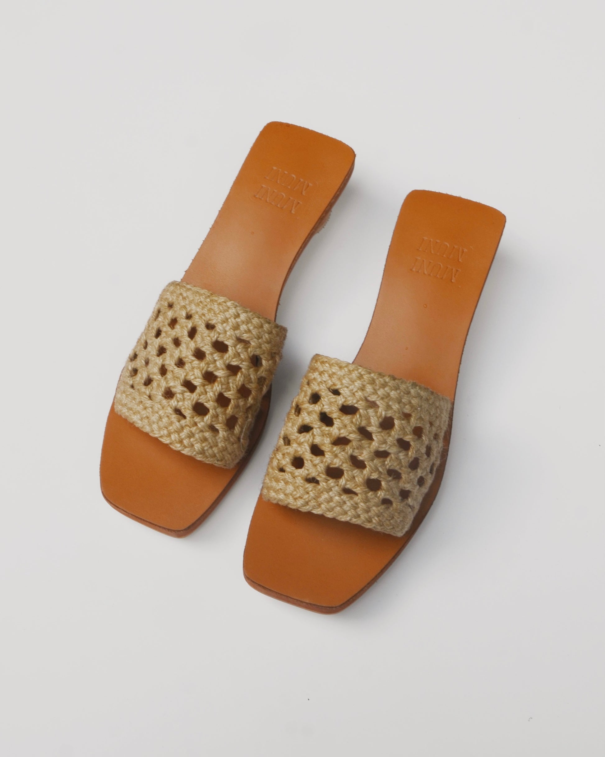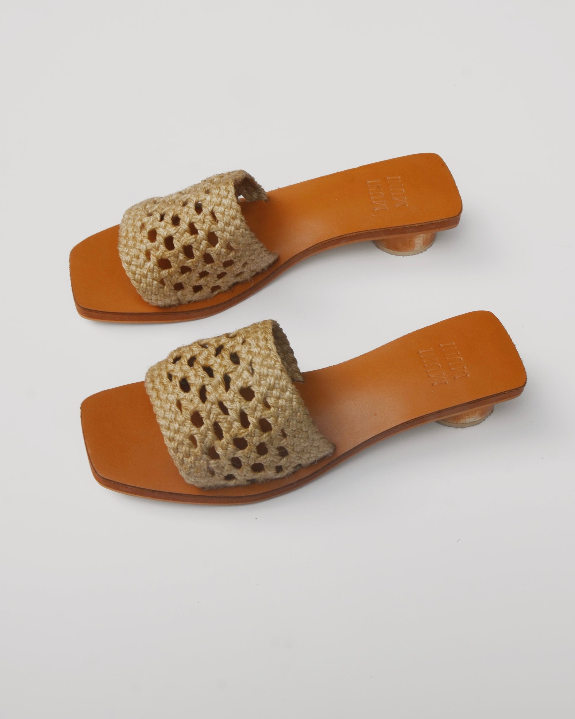 Low heeled sandals by Muni Muni, sourced and produced locally, integrated on vegan leather soles with wooden heels. *Note: Due to the hand-made nature of the product and naturally sourced materials, the colors and silhouettes may slightly vary across products