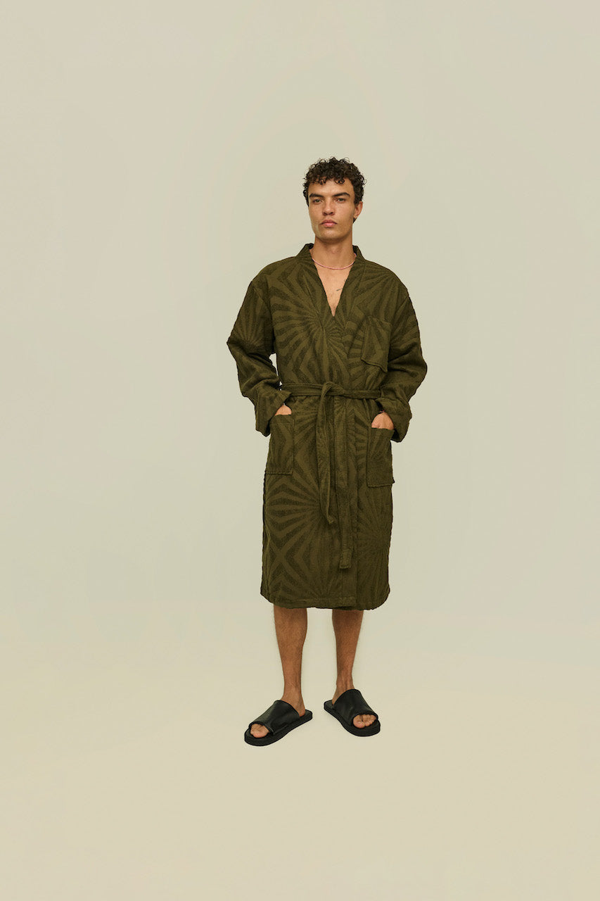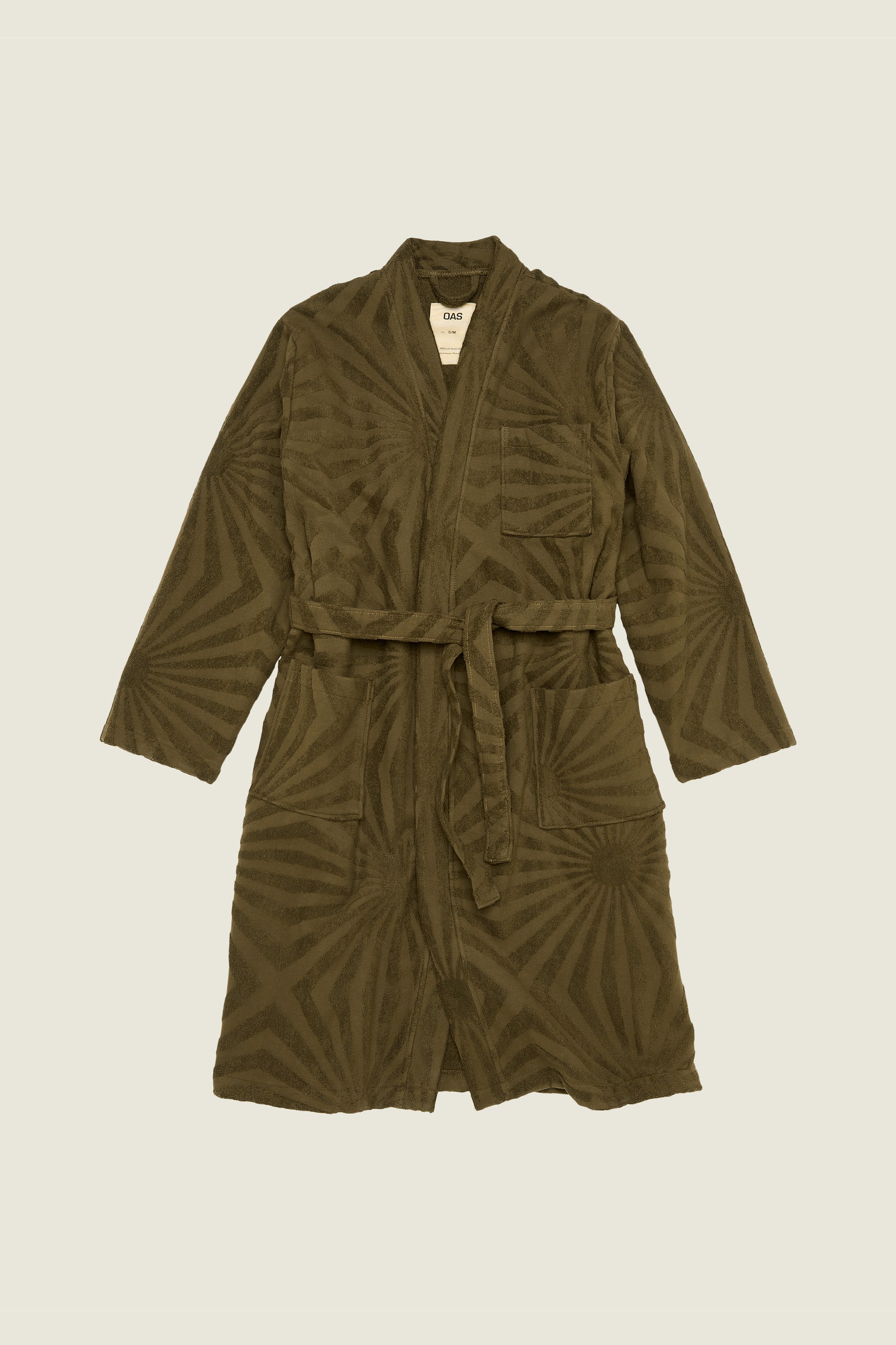The Olivado robe from Swedish brand OAS is jacquard-woven from soft and absorbent cotton terry to a textural pattern reminiscent of an optical illusion. Features two large front pockets and one chest pocket with self-belt tie at the waist.