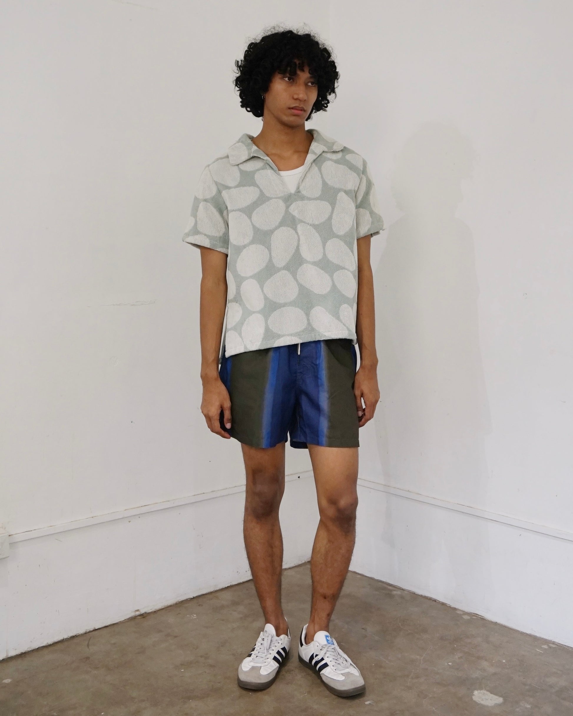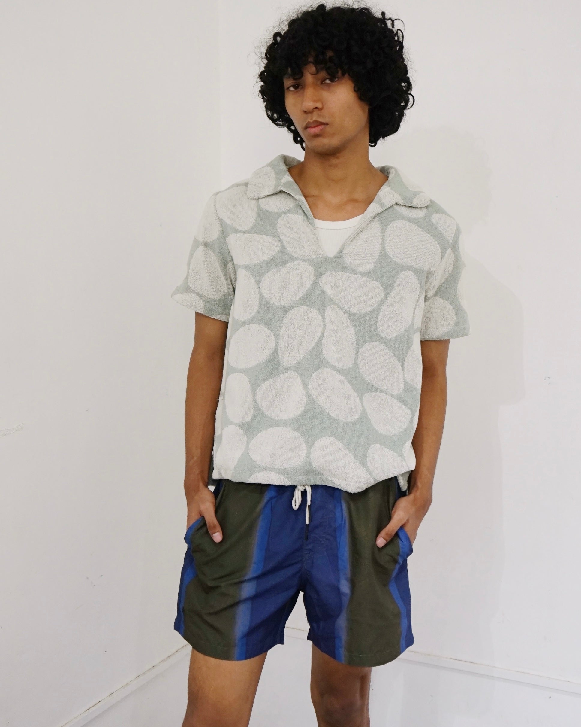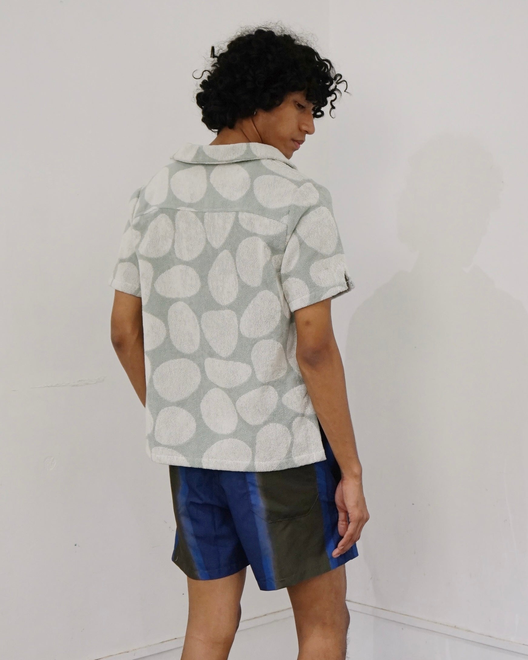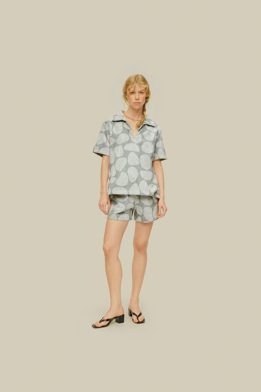 The Pebble Jaffa Terry Shirt showcases a unique pebble pattern, jacquard-woven from midweight cotton terry for a soft, breathable feel. Designed with an open collar and short sleeves, it's the perfect blend of comfort and style for relaxed days.