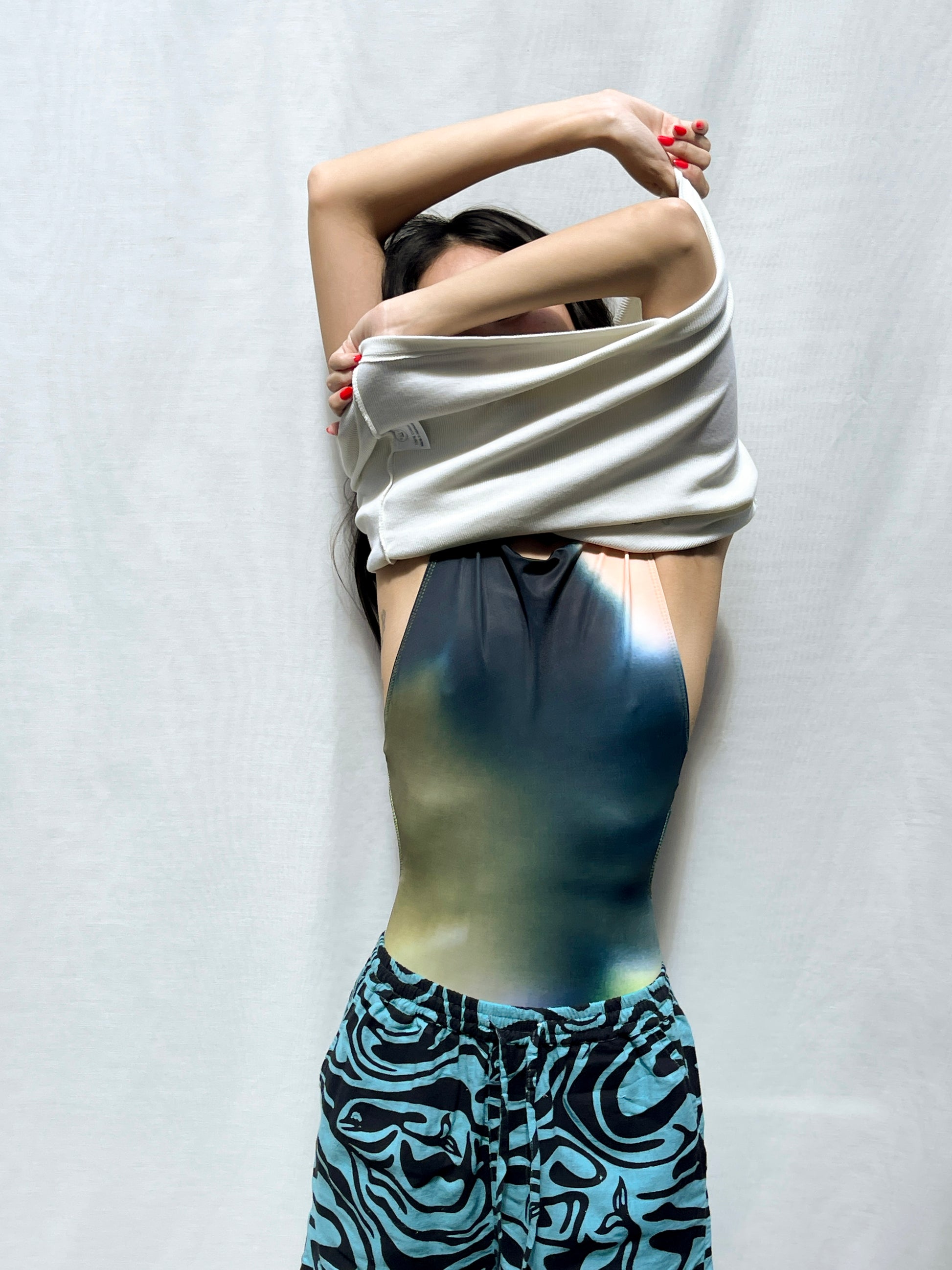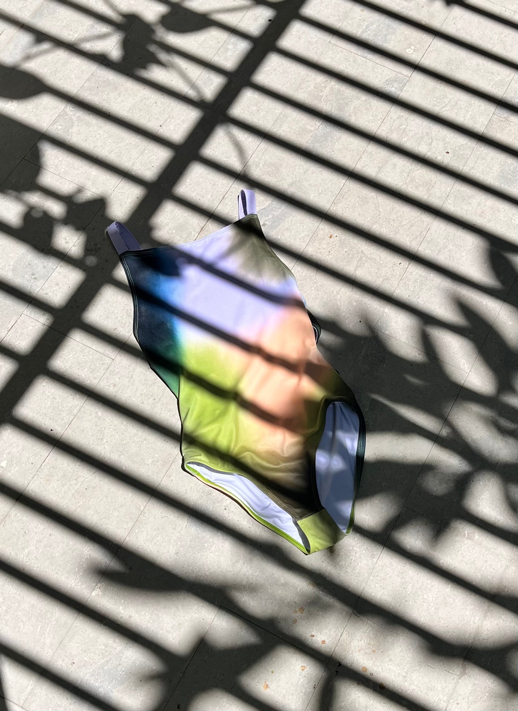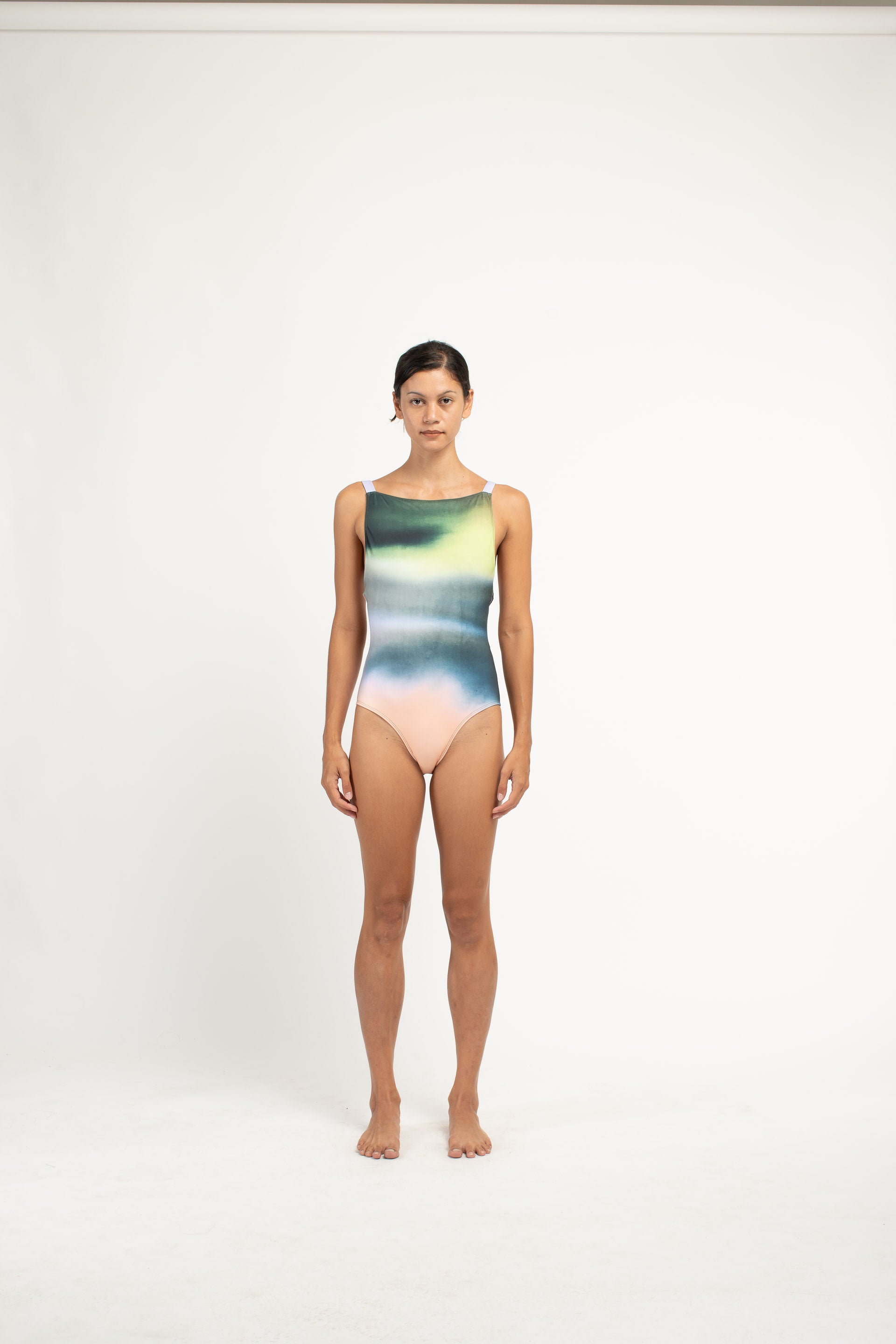 The Sonata Racer by SUKU is a sleek, sporty one-piece swimsuit designed with an open back and crossover side straps featuring elegant cutouts. Crafted from 82% recycled poly spandex and 18% elastane, it offers a comfortable, true-to-size fit with excellent stretch. The swimsuit showcases a unique hand-painted watercolor print created by skilled Batik artisans, sublimation dyed for lasting vibrancy. Ideal for those seeking both style and performance in swimwear.