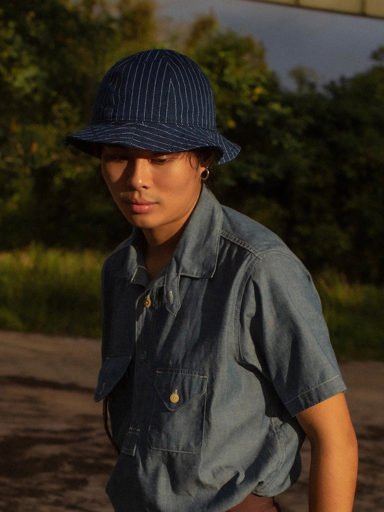A reproduction of the U.S. military issued hat with an all over wide brim made from cotton denim from Collect Mills Japan.