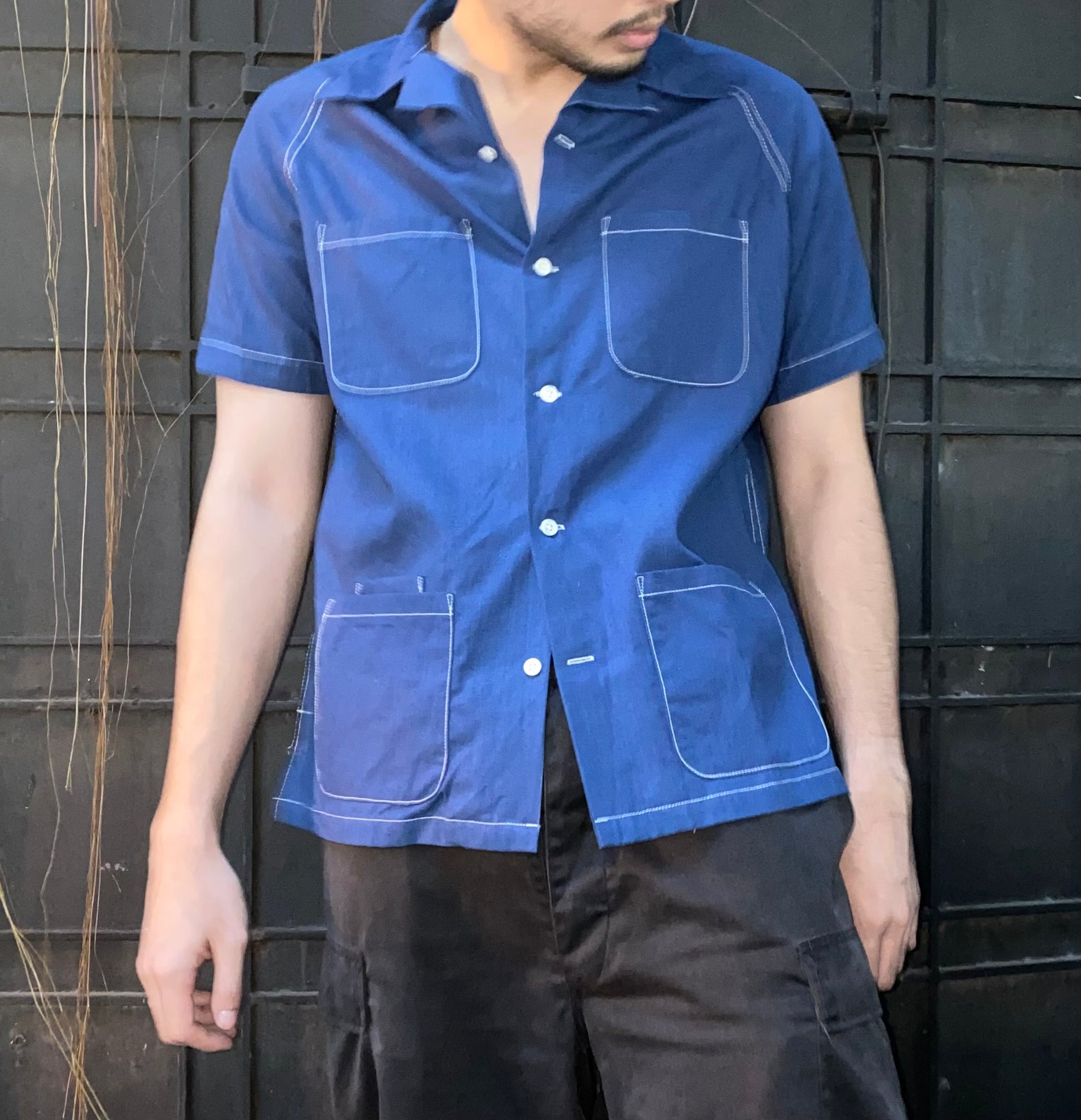 Summer button down shirt from the Tropa x Leon Denim Collaboration Collection. Made in a lightweight 5oz. indigo chambray from Collect Japan. Features 5 patch pockets, raglan sleeves, aluminum buttons and deadstock enclosure loop button from Japan.